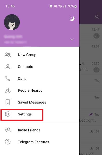Bước 4: Bạn mở ứng dụng Telegram trên điện thoại ra, sau đó chọn “Settings”