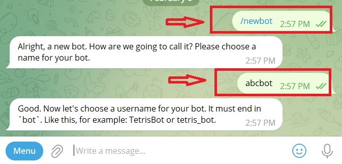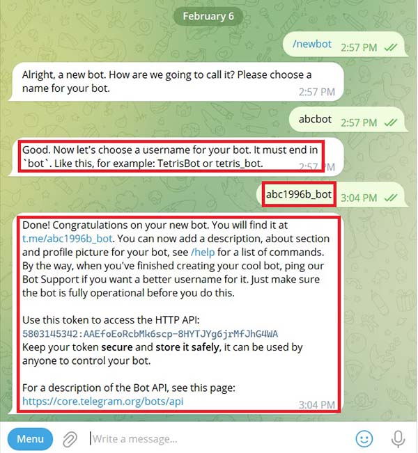 Bước 4: Bạn chat “/newbot” để tạo bot. Sau đó BotFather sẽ thông báo thành công. Tiếp đó bạn chat tên Bot muốn tạo. Ví dụ trong hình dưới, tên bot là “abcbot“