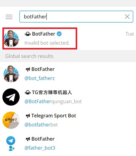 Bước 1: Đăng nhập tài khoản vào Telegram. Nếu muốn cài đặt được Bot, bạn phải nhắn tin với Bot Father. Trong khung tìm kiếm nhập” Bot Father→ chọn tài khoản có dấu tích xanh da trời.