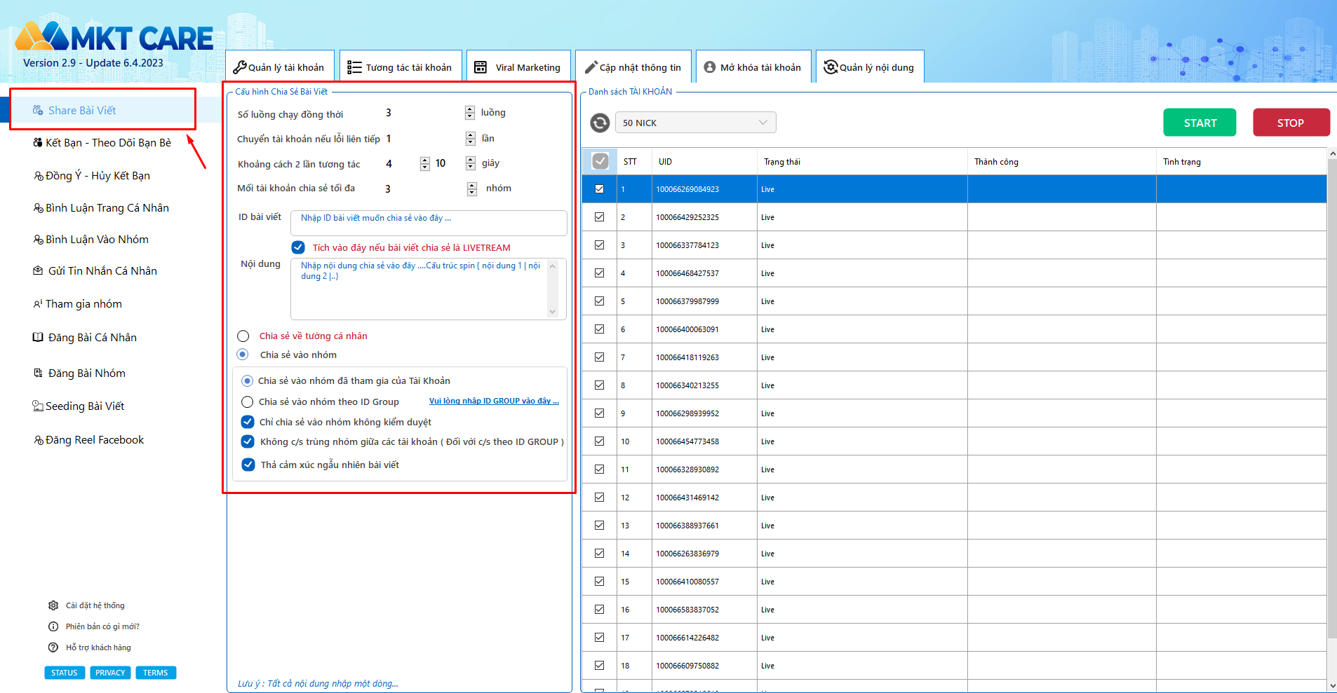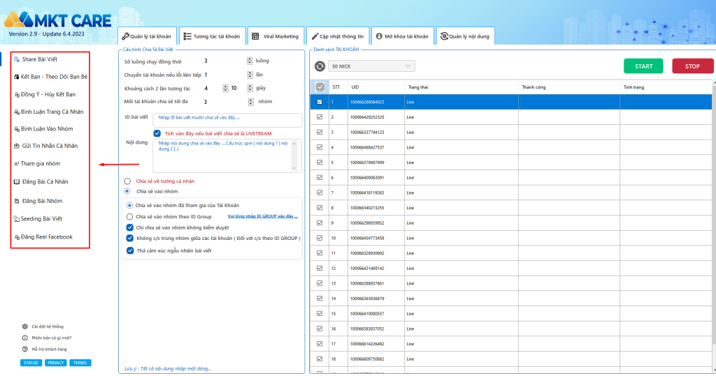 I. Tính năng chính của tool nuôi nick Facebook, chia sẻ livestream – MKT Care.