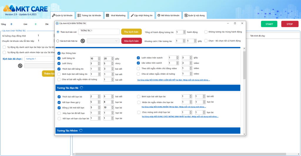 Facebook sẽ đánh giá rất cao những tài khoản có tương tác thường xuyên và liên tục. Vì vậy, quá trình chăm sóc nick FB là vô cùng quan trọng. Hiểu được điều đó, phần mềm nuôi nick Facebook tự động – MKT CARE bao gồm đa dạng các tính năng như: